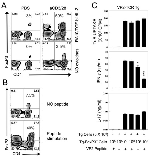 To further understand the potential role of FoxP3+CD4+ T cells in the pathogenesis of TMEV-induced demyelinating disease, we generated activated VP2-TCR-Tg FoxP3+CD4+ T cells in vitro using a mixture of retinoic acid, TGF-β, IL-2, and a T cell stimulant (VP272-86 or anti-CD3/CD28 antibodies), as previously described [28,29]. Under this condition, 40–60% of CD25+CD4+ T cells expressed FoxP3 (Figure 6A,B). TMEV-infected DCs induced ~7% and VP274-86-loaded DCs induced 2% FoxP3+CD4+ T cells from naive VP2-TCR-Tg CD4+ T cells in the absence of the added cytokines (not shown). These results suggest that the cytokine environment of virus-infected cells determines the induction of FoxP3+CD4+ T cells from naive CD4+ T cells. We further assessed the inhibitory function of VP2-reactive TCR-Tg FoxP3+CD4+ T cells against the proliferative responses and their cytokine production of VP2-TCR-Tg CD4+ T cells in the presence of the specific epitope peptide, VP272-86 (Figure 6C). This result clearly indicates that the activated VP2-TCR-Tg FoxP3+CD4+ T cells did not inhibit the proliferative responses of CD4+ T cells reactive to the identical epitope. Furthermore, only the production of IFN-γ (but not IL-17) by the VP2-specific CD4+ T cells in response to VP272-86 was significantly inhibited in the presence of activated VP2-TCR-Tg FoxP3+CD4+ T cells in a dose-dependent manner (Figure 6C). However, the epitope-preferred suppression of CD4+ T cell proliferation was previously demonstrated with TCR-Tg FoxP3+CD4+ T cells from mice infected with mouse hepatitis virus [30]. Therefore, epitope-specific FoxP3+CD4+ T cells from TMEV-infected susceptible mice may have a regulatory function limited to the production of a certain cytokine by the same epitope-recognizing CD4+ T cells.
