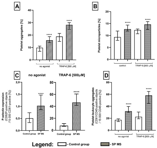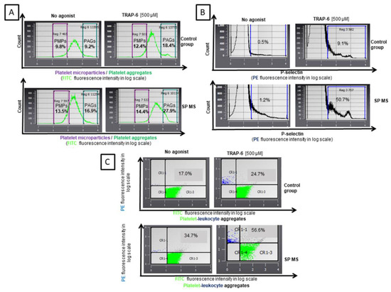 As a result of our analysis, we demonstrated an explicit increase in the formation of platelet aggregates (PAGs), platelet-derived microparticles (PMPs), platelet-leukocyte aggregates (PLAs), as well as a higher expression of surface P-selectin (CD62P) in SP MS patients compared to a control group, both in non-stimulated (no agonist) and TRAP-6-stimulated blood platelets. Whole blood assays performed by flow cytometry, without isolating platelets, avoided non-specific activation of these cells and the formation of artifacts. We showed that in quiescent platelets from SP MS patients there was an elevated level of PAGs (approximately 2-fold vs. control, p < 0.0001) (Figure 1A), PMPs (1.5-fold vs. control, p < 0.0001) (Figure 1B), PLAs (2-fold vs. control, p < 0.0001) (Figure 1C), as well as the higher surface expression of P-selectin (over 2-fold vs. control, p < 0.0001) (Figure 1D). The examination of blood platelets responsiveness to the action of TRAP-6 (500 µM) indicated a higher percentage of PAGs (1.5-fold vs. control, p < 0.0001) (Figure 1A), PMPs (1.2-fold vs. control, p < 0.0001) (Figure 1B), and PLAs (2-fold vs. control, p < 0.0001) (Figure 1C), and also a significantly increased expression of surface P-selectin in SP MS (approximately 6-fold increase, p < 0.0001) (Figure 1D). Figure 2 features the representative histograms, showing the percentage distribution of PAGs and PMPs in the total pool of CD61-positive objects (Figure 2A) and level of surface-exposed P-selectin (Figure 2B), as well as double fluorescence dot plots expressing the formation of PLAs (Figure 2C) in blood samples (without agonist and with TRAP-6) from the control group and SP MS.