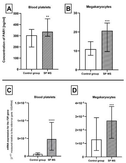 The level of PAR1 (ng/mL) ± SD and the relative expression of the F2R gene (according to the reference gene—18SrRNA) measured at the mRNA level in platelets (A and C, respectively) and megakaryocytes (B and D, respectively) from SP MS patients (n = 45) and the control group (n = 45). Statistical analysis was performed using the Mann–Whitney U test. The results are expressed as a median and interquartile range (IQR), ** p < 0.01, *** p < 0.001, **** p < 0.0001.