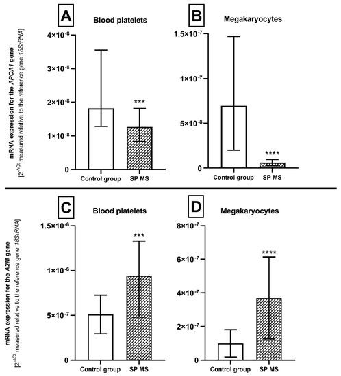 Expression of the APOA1 and A2M genes (measured at the mRNA level) in platelets (A and C, respectively) and megakaryocytes (B and D, respectively) from SP MS patients (n = 45) and the control group (n = 45). Statistical analysis was performed using the Mann–Whitney U test. The results are expressed as the median of 2−ΔCt and interquartile range (IQR) (according to the reference gene—18SrRNA), *** p < 0.001, **** p < 0.0001.