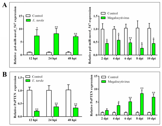 Expression of pol–miR-novel_547 (A) and phosphatase and tensin (PTEN) homolog of flounder (PoPTEN) (B) in response to bacterial and viral infection. Flounder were infected with or without (control) Edwardsiella tarda or megalocytivirus, and the expressions of pol–miR-novel_547 (A) and PoPTEN (B) in kidney were determined by quantitative real time RT-PCR at different times. hpi, hour post-infection; dpi, day post-infection. Values are the means of triplicate experiments and shown as means ± SD. * p < 0.05; ** p < 0.01.