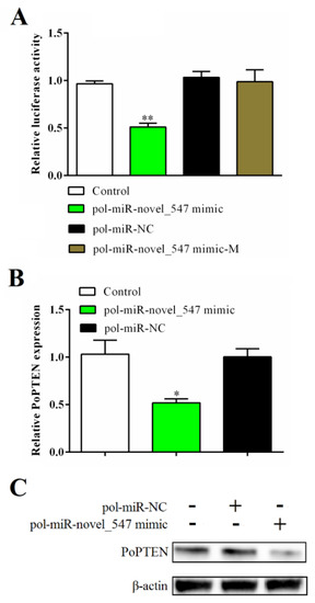 2.2. Pol–miR-novel_547 Negatively Regulates PoPTEN