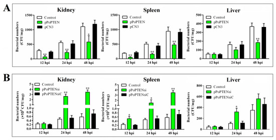 In vivo effects of PoPTEN on bacterial infection in flounder. For PoPTEN overexpression, flounder were treated with or without (control) pPoPTEN or the control plasmid pCN3 (A), for PoPTEN knockdown, flounder were treated with or without (control) pPoPTENsi or the control plasmid pPoPTENsiC (B). The fish were infected with Edwardsiella tarda, and bacterial numbers in kidney, spleen, and liver were determined at different times. Values are the means of triplicate experiments and shown as means ± SD. * p < 0.05; ** p < 0.01.