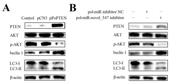 Effects of PoPTEN and pol-miR-novel_547 on the expression of autophagy-related genes in mammalian and fish cells. (A) HEK293T cells were transfected with or without (control) pPoPTEN or pCN3 for 24 h. (B) FG-9307 cells were transfected with or without (control) pol-miR-novel_547 inhibitor or pol-miR-NC inhibitor for 24 h. For both panels, PTEN, AKT, p-AKT (phosphorylated AKT), beclin 1, and LC3 proteins were detected by Western blot. β-actin was used as a loading control.
