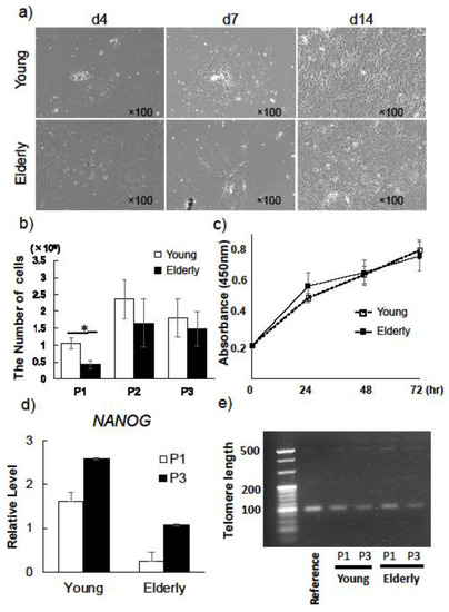 Characterization of dental pulp stem cells (DPSCs) derived from young and elderly patients. (a) Cell morphology of DPSCs derived from young and elderly patients at initial culture. Gross view at day 4, day 7, and day 14. (b) Comparison of proliferation potential of DPSCs derived from young and elderly patients in passage 1 (P1) to P3. The number of collected cells was counted at each passage (n = 4) (* p < 0.05). (c) Proliferation ability of young and elderly DPSCs at P2 were analyzed at 24, 48, and 72 h of culture. (n = 4) (* p < 0.05). (d) Comparison of expression of stem cell marker (NANOG) in the DPSCs derived from young and elderly patients at P1 and P3 (n = 4) (* p < 0.05). (e) Comparison of telomere length in the DPSCs derived from young and elderly patients at P1 and P3. The reference genomic DNA sample with known telomere length is shown on the left (n = 3). The experiments were repeated three times, and one representative image is presented.