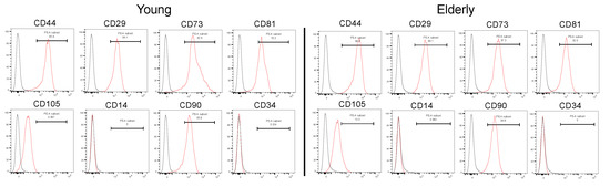 Flow cytometry analysis of dental pulp stem cells (DPSCs) derived from young and elderly patients. DPSCs were cultured at passage 3 (P3) or P4 and surface stained with phycoerythrin-conjugated CD14, CD29, CD34, CD44, CD73 CD81, CD90, and CD105. Fluorescent signals were measured using flow cytometry analysis. Cells that were not treated with fluorescent antibodies were used as controls. Isotype controls are represented by black curves, and labelled cells are represented by red curves. The experiments were repeated three times (n = 4), and one piece of representative data is presented.