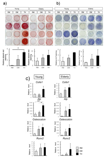 Human dental pulp stem cells were isolated from extracted teeth from 4 young (16–18 years old) and 4 elderly (41–54 years old) patients in good health (hereafter referred to as “young DPSCs” and “elderly DPSCs”, respectively)—after obtaining informed consent—at Tokyo Medical University Hospital. This study was approved by the institutional ethics committee of the Faculty of Medicine, Tokyo Medical University, Japan (approval No. 3486, approved on 4 October 2016). Dental pulp was extracted and minced into small pieces, followed by enzymatic digestion using 3 mg/mL collagenase type I (Sigma-Aldrich, St Louis, MO, USA) for 45 min at 37 °C; single-cell suspensions were obtained by passing the cells through a 70 µm cell strainer. The isolated cells were plated at a density of 1 × 105 cells on 100 mm dishes and cultured in alpha-modified Eagle’s medium (αMEM; Gibco/BRL) supplemented with 15% fetal bovine serum (FBS; Biowest, Nuaillé, France) and 1% penicillin/streptomycin (P/S; Wako Pure Chemical Industries, Osaka, Japan). Cells were passaged at 70% confluence. Young and elderly DPSCs in passage 3 (P3) or P4 were used for experiments. Dental pulp stem cells were cultured in 12-well plates containing osteogenic differentiation media with and without TH. We used αMEM supplemented with 10% FBS, 1% P/S, and 10 nM dexamethasone (Wako Pure Chemical Industries) for osteogenic induction (osteogenic medium (OM)). We added TH (Takeda Chemical Industries, Osaka, Japan) at the optimal concentration of 10−6 M to the OM, as described previously [15].