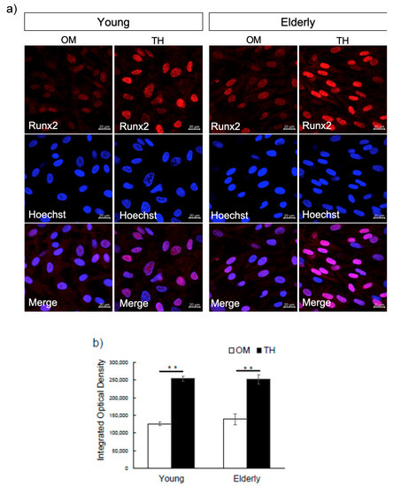 To gain further insight into the effect of TH on osteogenic differentiation, we next detected the expression of Runx2 by performing immunocytochemical analysis. The immunocytochemistry revealed that expression of Runx2 was stronger in both young and elderly TH-induced DPSCs compared to that in OM (Figure 4a). Next, we compared the nuclear intensity of Runx2 immunofluorescent signals detected in TH-induced DPSCs with that in OM. TH upregulated integrated density levels of nuclear Runx2 in comparison with OM at a significant level in both young and elderly DPSCs (Figure 4b).