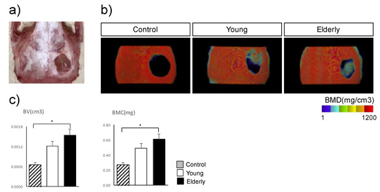 The calvarial defects were examined by micro-computed tomography (micro-CT; SMX-90CT, Shimadzu, Kyoto, Japan) The scanning conditions were as follows: 90 kV, 110 µA, and a field of view (XY) of 10 mm; the resolution of one CT slice was 512 × 512 pixels. The data were reconstructed and analyzed using the morphometric software TRI/3D-BON (Ratoc System Engineering, Tokyo, Japan). Bone volume (BV), bone mineral content (BMC), and bone mineral density (BMD) of a 5 × 5 × 3 mm3 cuboid area located in the center of the initial defect area were calculated.