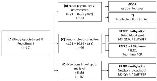 Methods and comparisons flowchart. (A) Sixty five Australian children with fragile X syndrome (FXS) aged 1.71 to 16.93 years old: (35.4% female) were recruited into the study and provided consent to: (B) undergo neuropsychological assessments (Autism Diagnostic Observation Schedule – Second Edition (ADOS-2) and Intelligence Quotient (IQ)); (C) provide blood to create dried blood spot (DBS) for Fragile X-Related Epigenetic Element 2 methylation (FREE2m) analyses and for isolation of peripheral blood mononuclear cells (PBMCs) for fragile X mental retardation 1 gene (FMR1) expression analyses; and (D) for retrieval of newborn blood spots (NBS) collected at birth for FREE2m analyses. The differences in numbers analysed for outcomes from (A) to (D) reflect differences due to proportion of participants that: (1) did not provide blood at recruitment, but did provide consent for NBS retrieval, where NBS samples could be located and retrieved; (2) did provide blood at recruitment and consent for NBS retrieval, where NBS samples could not be located and retrieved; (3) did not complete neuropsychological assessments and/or did not obtain valid scores. FMR1 mRNA levels in PBMCs were analysed using the reverse transcription real-time PCR relative standard curve method []. FREE2m of NBS and DBS samples was analysed using Methylation Specific Quantitative Melt Analysis (MS-QMA) and the EpiTYPER system []. While both methods target the same locus consisting of 12 CpG sites, the EpiTYPER system is unable to analyse methylation of CpG’s 3, 4 and 5 as the cluster of fragments is too big in size (Daltons) to be captured by the mass-spectrum utilised by this system, as previously described [,]. For the remaining CpG sites the EpiTYPER system is able to provide CpG site-specific methylation. MS-QMA analysis provides a single aggregate measure of methylation across 11 out of 12 CpG sites (all but CpG 1).