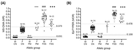 FREE2 aggregate methylation ratio (MR) determined using: (A) MS-QMA (CpG 2-12) in retrieved NBS samples stratified by gender and allelic group (males: 89 control (CN) newborns, and 6 PM and 37 FXS participants aged 1.89 to 16.93 years old at time of retrieval; females: 95 CN newborns, and 10 PM and 21 FXS participants aged 0.54 to 18.27 years old at time of retrieval); (B) FREE2 aggregate methylation output ratio (MOR) determined using the EpiTYPER system (mean CpG’s 1, 2, 6/7, 8/9 and 10-12 MOR) in the same cohort (males: 79 CN, and 10 PM and 35 FXS participants; females: 74 CN newborns, and 10 PM and 19 FXS participants. CN = control; F = female; FREE2 = fragile X-related epigenetic element 2; FXS: fragile X syndrome (FM and PM/FM); M = male; MS-QMA = methylation specific-quantitative melt analysis; PM = premutation. Circles represent males, triangles represent females, hollow symbols represent PM/FM mosaic individuals, and a hollow square represents the normal size (NS)/PM/FM mosaic individual (here NS represents alleles <44 CGGs). *** Significant difference between FXS males and PM and CN males (p < 0.001); ### significant difference between FXS females and PM and CN females (p <0.001); +++ significant difference between PM and CN females (p = 0.016). Dotted lines represent the optimal threshold for differentiating FXS participants from other groups, determined for males by the maximum control value and for females by the receiver operating characteristic curve. Significant p values are in bold.