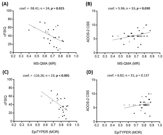 The analysis was also performed with a subsample of children with all data available (i.e., both NBS and DBS results). This sub-sample included 12 females (mean age = 7.43 years; 83.33% FM only) and 14 males (mean age = 7.55 years; 78.57% FM only). Results were similar in this subsample of males and females for associations between FREE2m in NBS and corrected IQ and ADOS-2 scores (Supplementary Tables S8 and S9). However, CpG 8/9 DNAm in NBS was no longer significantly associated with any corrected IQ or ADOS-2 scores in males and only aggregate FREE2m by MS-QMA was significantly associated cVIQ scores. In contrast, CpG 2 and CpG 8/9 were significantly associated with cVIQ in females in this subsample (Supplementary Table S8).