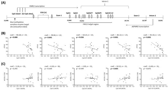 The FMR1 exon 1/intron 1 boundary, known as the Fragile X-Related Epigenetic Element 2 (FREE2) forms an extended portion of the FMR1 promoter [], and is sensitive to X-chromosome inactivation [,]. The extent of DNAm of this region has been shown to correlate with FMRP levels in blood and intellectual functioning in males and females affected with FXS [,,,]. FREE2 methylation (FREE2m) has been associated with presence of FM alleles in numerous tissue types, including: venous blood, saliva, lymphoblasts, chorionic villi [,,], adult and newborn blood spots, epithelial cells, embryonic stem cells and primary neurons from post mortem brains [,,,,,], with some studies using a different name for the FREE2 region—for example FMR1 “down-stream region” as in Esanov et al., []. Importantly, mRNA transcribed from the expanded CGG repeat has been shown to contribute to silencing of FMR1, by binding to the gene, with the highest affinity for binding shown for the FREE2 region, as compared to the rest of the promoter [].