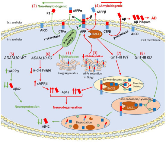 Schematic representation of APP intracellular maturation and its cleavage by secretases. (1) β-Amyloid precursor protein (APP) undergoes glycosylation in the Golgi apparatus and, then, translocates to cell membrane for secretase cleavage (2) The increase of APP glycosylation drives toward the non-amyloidogenic pathway. α-secretase cleaves APP within the β-Amyloid (Aβ) sequence producing the C-terminal fragment α (CTFα) and soluble N-terminal fragment α (sAPPα), which has neuroprotective properties. Afterwards, γ-secretase cleaves CTFα into N-terminal fragment (P3) and a soluble APP intracellular domain (AICD). (3) The pharmacological inhibition of APP glycosylation retains the protein in the Golgi apparatus preventing its transport to cell membrane. The reduction of the glycosylation process drives the amyloidogenic pathway. (4) In the amyloidogenic pathway, β-secretase cleaves APP producing soluble N-terminal fragment β (sAPPβ) and membrane bound C-terminal fragment β (CTFβ). Then, γ-secretase processes CTFβ into AICD and Aβ42, which forms extracellular Aβ plaques. (5) α-secretase is a member of ‘a disintegrin and metalloprotease’ (ADAM) family and, in particular, ADAM10 cleaves APP increasing the levels of sAPPα leading to neuroprotection. (6) The genetic deletion of ADAM10 suppresses the α-cleavage of APP, decreases in sAPPα levels and increases Aβ42 formation in ADAM10 knockout (KO) mice (Adam10−/−). (7) β-site APP cleaving enzyme-1 (BACE1) contains N-glycans, which are further modified by a glycosyltransferases, namely β1,4-N-acetylglucosaminyltransferase (GnT-III) that is encoded by the Mgat3 gene. In GnT-III WT mice (Mgat3+/+ mice), BACE1 localizes in early endosomes and is modified by GnT-III to bear bisecting GlcNAc generating Aβ42 elevation. (8) In contrast, in GnT-III knockout (KO) mice (Mgat−/− mice), BACE1 is relocated to late endosomes/lysosomes where BACE1 is degraded leading to a decrease of Aβ42 levels. (Red/green up arrows: Increase; Red/green down arrows: Decrease).
