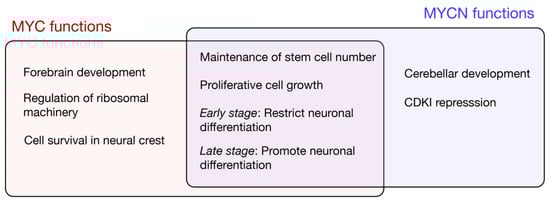 Given the embryonic lethality associated with the complete loss of Myc or N-Myc, subsequent studies limited depletion to neural stem cells and intermediate neural progenitor cells using Nestin-Cre []. The general functions of MYC and MYCN uncovered using neural-specific depletion are outlined in Figure 2. A conditional N-Myc knockout reduces the brain size and is associated with the disorganisation of the cerebellum and cortex; the reduced proliferation and diminished cell density is associated with a decreased expression of the G1-S phase cyclin, CycD []. Furthermore, Cyclin Dependent Kinase Inhibitors (CDKIs) p18INK4c and p27Kip are upregulated following N-Myc knockdown, and the deletion of either CDKI partially restores the cerebellar development []. Given that p18INK4c and p27Kip1 promote the differentiation of neural and oligodendrocyte precursors, respectively [], MYCN likely functions to ensure progenitor renewal by maintaining a low expression of CDKIs during the growth phase of brain development. The mechanisms of the MYCN-mediated repression of CDKIs are unclear; while MYCN associates more weakly with the MIZ1 repressor when compared to MYC [,], at least in the context of prostate cancer, MYCN can also bind and recruit the PRC2 histone methylase to repress target genes []. The upregulation of CDKIs alone does not, however, explain the differential effects of MYCN across neural lineages. For example, N-Myc depletion increases the expression of the neuronal differentiation marker βTubIII/Tuj1 but does not alter the glial marker GFAP, suggesting that MYCN is required for neuronal but not glial differentiation []. A Nestin-driven Myc knockout also results in reduced brain growth, but with less pronounced cerebellar defects than those observed for N-Myc []. The abundant MYCN in the cerebellum likely maintains progenitor proliferation in the absence of MYC.