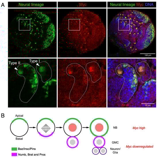Neural stem cell determinants are conserved between vertebrates and invertebrates; thus, Drosophila models have provided significant insights into neural stem cell fate control. The Drosophila neural stem cells or neuroblasts (NBs) undergo asymmetric cell division for self-renewal in order to maintain the stem cell population and generate intermediate progenitors that differentiate to give the neuronal and glial populations that comprise the developing brain (reviewed in []). The single Myc family protein is highly expressed in neuroblasts and is decreased in progenitors [] (Figure 3A).