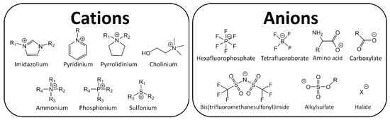 Empirical approaches correlate IL properties with their respective structure. Among the transport properties of ILs, viscosity is one of the most studied because of its importance to electrochemical and separating applications. IL viscosities usually vary between 20 and 40,000 cP, which is 1 order of magnitude higher than that of conventional solvents, such as water, with a viscosity of ~1 cP. A general trend is that the viscosity decreases with the increasing size of ions, with a greater dependence on the anion. For cations, the viscosity increases with the increasing length of the alkyl chains partially due to stronger van der Waals (VDW) interactions. A relationship between the viscosity and the symmetry of the cations was also disclosed, with asymmetric cations exhibiting linear correlations opposing the small and symmetric cations. Besides the size and shape of ions, viscosity is also closely related to intermolecular interactions. High interaction energy, due to electrostatic forces and VDW interactions between anion and cation, leads to higher viscosity. Additionally, viscosity also correlates with ion stacking caused by hydrogen bonding, with smaller interactions leading to lower viscosity, and with the delocalization of the charge on the anion that weakens the hydrogen bond, and consequently decreases the viscosity. Conductivity is also frequently studied and lays within the range of 0.1–30 m.S cm−1. At low temperatures, the structures of cations and anions influence the conductivity of ILs. The conductivity usually decreases with the increasing length of alkyl chains of cations, and the anions have a more significant effect on the conductivity, with a higher influence of the charge distribution and the number of charge carriers [32].