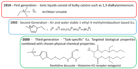 During the first decade after the publication of Wilkes and Zaworotko [19], solid scientific background was built on the subject of ILs and specific applications started to be targeted. In Ann Visser’s paper, a series of functionalized imidazolium-based ILs was synthesized to extract heavy metals, Hg+2 and Cd+2 from aqueous solutions [21,22], and the terminology “Task-Specific” was introduced in connection to IL applications. Tuneable physical and chemical properties according to the desired application are what defines the Third Generation of ILs, see Figure 3. Among these properties, rationally selected biological action is already a reality, as evidenced by Hough’s review [23] where several ILs candidates were used as Active Pharmaceutical Ingredients (API) or precursors.