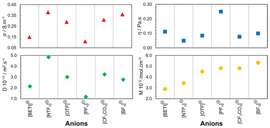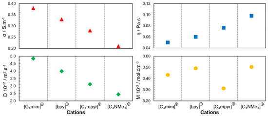 Cation dependence of viscosity (η), electrical conductivity (σ), self-diffusion (D) and molar concentration (M) for [NTF2]− -based ILs at 298 K and 0.1 MPa. The diffusion coefficient presented is the result of the sum of cation and anion self-diffusion. Image created using data published in references [35,36,37].