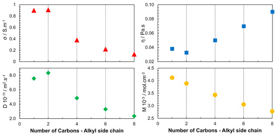 Alkyl-chain-length dependence of viscosity (η), electrical conductivity (σ), self-diffusion (D) and molar concentration (M) for [Cnmim][NTF2] at 298 K and 0.1 MPa. The diffusion coefficient presented is the result of the sum of cation and anion self-diffusion. Image created using data published in references [34,36].