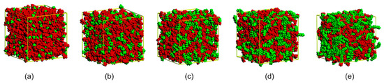 Snapshots of simulation boxes of [Cnmim][PF6]. Red=polar and green = nonpolar. (a) [C2mim][PF6]; (b) [C4mim][PF6]; (c) [C6mim][PF6]; (d) [C8mim][PF6] and (e) [C12mim][PF6]. Figure adapted from [45].