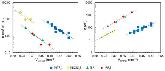 Based on the free volume models of liquids, correlations between transport properties and molecular volume are qualitatively expected. In this context, Slattery et al. have shown a strong correlation of (Table 1) with viscosity and conductivity (Figure 11) [79]. The conductivity of these ILs decreases exponentially with increasing (a) while the viscosity increases (b). The authors found three separated clusters in these correlations, according to the anion type: [BF4]− and [PF6]−; dicyanamide [DCA]− and [NTF2]−, as observed in Figure 11