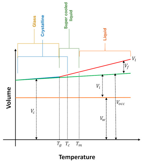 Schematic representation of the constitution of the volume, at isobaric condition. interstitial volume; free volume; total volume of the liquid; volume of the crystal; Van der Walls volume; occupied volume; glass transition temperature; —crystallization temperature; Melting temperature. Adapted from references [3,82].