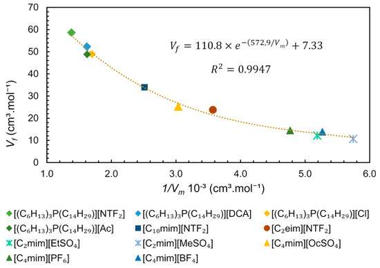 Free volume fraction () dependence of inverse of Molar Volume ( ) of IL at 313 K and 0.1 MPa. The data for trihexyl(tetradecyl)phosphonium-based ILs from references [87,88], [C4mim]+-based ILs from [89] and the remaining ILs from [90].