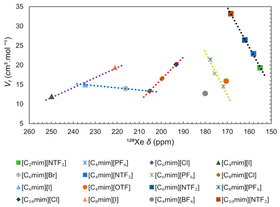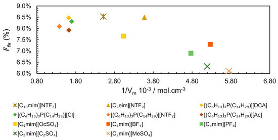 Analysing the existing data for different IL families, we constructed a plot correlating versus the inverse of Molar Volume (Figure 14) [87,88,89,90]. The values of vary from 0.0610 for [C2mim][MeSO4] to 0.0853 for [C10mim][NTF2], as seen in Figure 14, where is represented as a percentage. Apparently, the points seem scattered showing no correlation between the and the inverse of Molar Volume. However, it is possible to observe that ILs with lower Vm (which corresponds to a higher molar concentration) have a tendency to present lower total free volume, probably due to a more even distribution of smaller ions. A closer look into the structure of the ILs shows that in spite of very different Vm, higher values of are more easily reached in ILs with longer linear chains, such as [C10mim][NTF2] ( = 0.0850 and = 397.9 cm3.mol−1) and [(C6H13)3P(C14H29)][NTF2] ( = 0.0809 and = 723.9 cm3.mol−1).