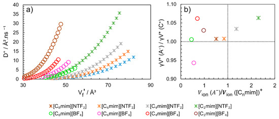 In Figure 15, two distinct dependencies of the ion size are observed. One for those ILs where the anion–cation volume ratio , i.e., the anion has a smaller molecular volume than cation ([C4mim]+ = 197 Å3), and another for anion–cation volume ratio >1.0, when the anion is bigger than the cation. Since for all ILs represented in this figure, is smaller than the , and according to the free volume theory, the size of cavities is fundamental for ion displacement, the observed dependence suggests that the displacement of ions in these ILs might be governed by the cation in the first region and by the anion in the second. In the first region, the is smaller than and is greater than the when X= [Cl]−, [BF4]−, [PF6]−. However, in the second region, when X = [FAP]−, [FPI]−, [B(hfip)4]−, the is greater than the and smaller than . In the ILs with X = [OTF]− and [NTF2]−, exceeds the size of both ions ( and ).