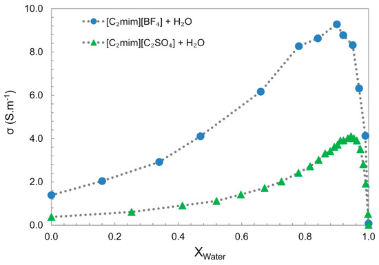 - Rilo, E.; Vila, J.; García-Garabal, S.; Varela, L.M.; Cabeza, O. Electrical Conductivity of Seven Binary Systems Containing 1-Ethyl-3-methyl Imidazolium Alkyl Sulfate Ionic Liquids with Water or Ethanol at Four Temperatures. J. Phys. Chem. B 2013, 117, 1411–1418. [Google Scholar] [CrossRef] [PubMed]