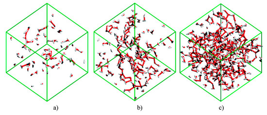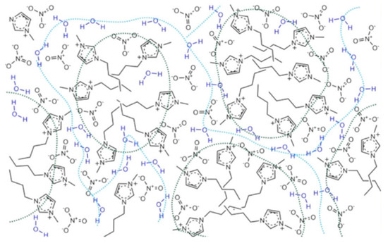 In 2005, another publication focused on the cation structure, where the alkyl chain length of 1-alkyl-3-methylimidazolium bis(trifluoromethane sulfonyl)imide ([Cnmim][NTF2]) was varied (n = 1, 2, 4, 6, 8) to study the ILs properties over a wide temperature range [34]. The increase in the alkyl chain length was found to cause changes in the interaction forces (VDW). The properties of the ILs were determined by the cumulative effect of the electrostatic interaction between the ionic species and the induction interactions between the ions, aggregates, and clusters (Figure 5). Among the studied ILs, [C2mim][NTF2] had the highest diffusivity and electrical conductivity and also the lowest viscosity at 298 K and 0.1 MPa.