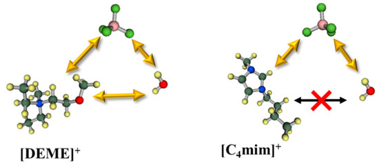 - Koishi, T. Molecular Dynamics Study of the Effect of Water on Hydrophilic and Hydrophobic Ionic Liquids. J. Phys. Chem. B 2018, 122, 12342–12350. [Google Scholar] [CrossRef]