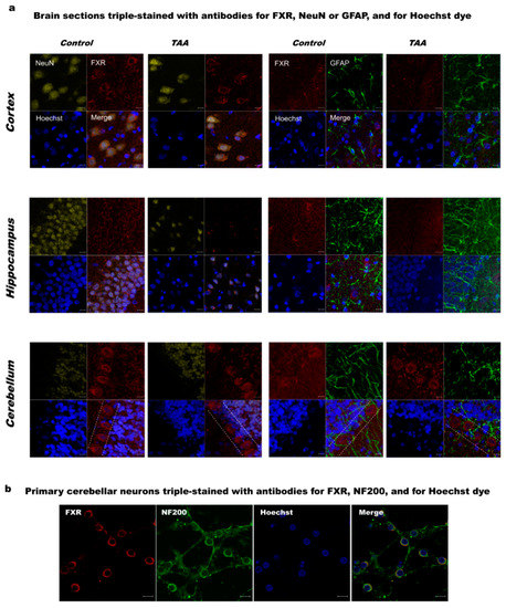 (a) Immunolabelling of farnesoid X receptor, FXR (red) in rat cerebral cortex, hippocampus, and cerebellum of control and thioacetamide (TAA) rats. Neurons were positively immunostained against the neuronal marker NeuN (yellow). Astrocytes were identified by immunostaining against the glial fibrillary acidic protein (GFAP, green). Blue Hoechst stain indicates the location of cell nuclei. Dashed lines indicate the Purkinje layer. Scale bars = 10 μm; (b) immunolabelling of FXR in the primary cultures of rat cerebellar neurons. Neurons were positively immunostained against the neuronal marker neurofilament 200 (NF200, green). Blue Hoechst stain indicates the location of cell nuclei. Scale bars = 10 μm.