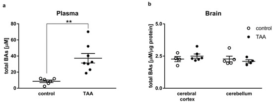 Total bile acids concentration in the plasma (a) and brain tissue homogenates (cerebral cortex and cerebellum) (b) of control and TAA rats. Black circles represent the TAA-treated group, whereas empty circles denote the control group. All data are presented as an overlaying scatter-plot of single data points ± SEM, n = 4–8. ** p < 0.01 compared with control.