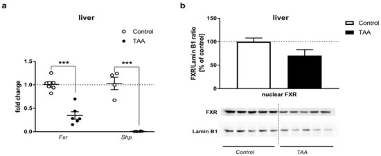 (a) Fxr and Shp mRNA expression in the liver of control and TAA rats. Black circles represent the TAA-treated group, whereas empty circles denote the control group. All data are presented as an overlaying scatter-plot of single data points ± SEM, n = 4–6. ***p < 0.001 compared with control; (b) the relative protein level of FXR (55 kDa) in the nuclear fraction of liver homogenate of control and TAA rats. Lamin B1 (66 kDa) was used as an internal control. Results are presented as the mean ± SEM, n = 5.