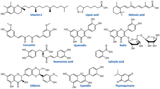 Isothiocyanates, a group of natural bioactive compounds mostly present in cruciferous vegetables, are characterized by their antioxidant properties [148]. That is what enabled them to be used in the alleviation of platinum drug-induced neurotoxicity. Allyl-isothiocyanate alleviated neuropathic pain induced by oxaliplatin in rats and reduced the hypersensitivity to cold non-noxious stimuli by releasing H2S [124]. Similarly, glucosinolate glucoraphanin and derived isothiocyanate sulforaphane exerted reducing effects on oxaliplatin induced-neuropathic pain in mice, in a dose-dependent manner by releasing H2S and modulating Kv7 channels [125]. The same research group, Di Cesare Mannelli et al. [126] conducted in vivo experiments on oxaliplatin-induced neuropathy using silibinin as an antioxidant compound. Silibinin (Figure 2) is a flavonolignan isolated from Silybum marianum that possesses antioxidant and antineoplastic activities. In this study, silibinin reduced oxidative damage of oxaliplatin in rats at a concentration of 100 mg/kg. It also recovered motor coordination and showed a reduction in oxaliplatin-dependent pain induced by mechanical and thermal stimuli. Silibinin is one of the components in silymarin complex mixture which also contains three more flavonolignans (silychristin, silydianin, and taxifolin) and its use is mainly focused on liver disorders treatment [149]. Silymarin in rats, at a concentration of 100 mg/kg, decreased the anxiogenic effect of cisplatin treatment and exhibited significant antioxidant activity in brain tissues by lowering lipid peroxidation and elevating GSH levels and CAT and SOD activities [127].