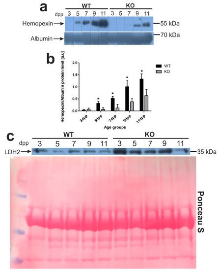 Hemopexin (Hx) and lactate dehydrogenase 2 (LDH2) proteins are markers of intravascular hemolysis in the blood of wild-type and Hmox1-deficient neonatal mice. (a) Plasma levels of hemopexin (Hx) were assessed by Western blotting. The blots were reprobed with polyclonal anti-albumin antibody as a loading control. Results come from three separate blots and relative levels of proteins are shown in the graph (b). Immunolabeled Hx and albumin control bands were quantified using a Molecular Imager and the relative levels of the test proteins (means ± SD, n = 3 per group) are plotted in arbitrary units. To compare differences in plasma Hx levels between wild-type (WT) and heme oxygenase 1 (HO1) knockout (KO) groups at each time point, we used Student t-tests for all datasets; * p < 0.05. (c) Lactate dehydrogenase 2 (LDH2) plasma levels in the serum from all age groups of wild-type and Hmox1−/− mice analyzed by Western blotting (WB; representative blot, n = 3). WB PVDF membrane stained with Ponceau S was used as a protein loading control. dpp—days postpartum.