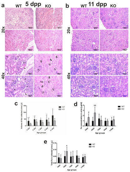 Kidney structure and urine analyses. (a,b) Hematoxylin–eosin staining of kidney sections from 5 and 11 day old (WT) and heme oxygenase 1 (HO1) knockout (KO) neonates; 20× magnification (upper panels) or 40× magnification (bottom panels). Scale bars correspond to 100 µm in 20× magnification and 50 µm in 40× magnification. (c) Iron concentration measured by AAS (atomic absorption spectroscopy) in urine samples of the WT and KO neonates from all age groups: n = 6 for WT 3 dpp, n = 10 for WT 5 dpp, n = 10 for WT 7 dpp, n = 5 for WT 9 dpp, n = 6 for WT 11 dpp, n = 5 for KO 3 dpp, n = 9 for KO 5 dpp, n = 5 for KO 7 dpp, n = 5 for KO 9 dpp, and n = 5 for KO 11 dpp. To compare differences in urine iron concentration between WT and KO groups at each time point, Student t-tests were used for all datasets. (d) Urine volume collected from urinary bladder of mice after dissection: n = 16 for WT 3 dpp, n = 19 for WT 5 dpp, n = 8 for WT 7 dpp, n = 12 for WT 9 dpp, n = 14 for WT 11 dpp, n = 14 for KO 3 dpp, n = 18 for KO 5 dpp, n = 7 for KO 7 dpp, n = 9 for KO 9 dpp, and n = 9 for KO 11 dpp. To compare differences in collected urine volumes between WT and Hmox1 knockout (KO) groups at each time point, Student t-tests were used in 3 dpp, 5 dpp, 7 dpp, and 9 dpp age groups (where data distribution was normal) and a Mann–Whitney U test was used in the 11 dpp age group (where data distribution was not normal). (e) Iron content in urine collected from urinary bladder of mice after dissection: n = 10 for WT 3 dpp, n = 12 for WT 5 dpp, n = 9 for WT 7 dpp, n = 5 for WT 9 dpp, n = 6 for WT 11 dpp, n = 5 for KO 3 dpp, n = 9 for KO 5 dpp, n = 5 for KO 7 dpp, n = 5 for KO 9 dpp, and n = 5 for KO 11 dpp. To compare differences in total urine iron content between WT and Hmox1 KO groups at each time point, we used Student t-tests in all age groups. Values are expressed as the means ± SD; * p < 0.05, ** p < 0.01, *** p < 0.001. dpp—days postpartum.