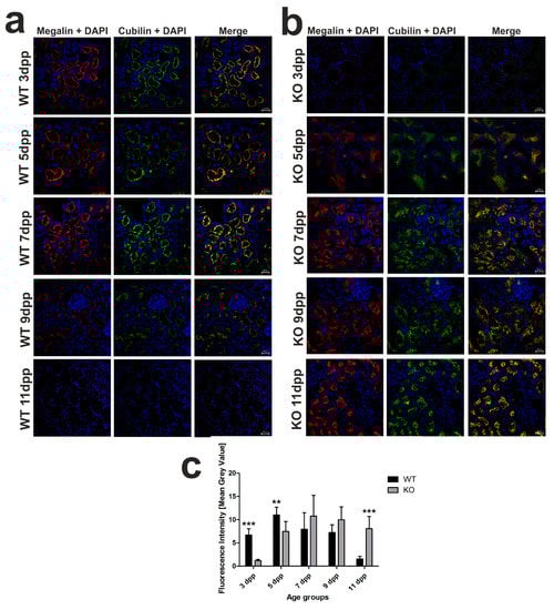 Localization of megalin–cubilin complex in renal proximal tubules in wild-type (WT) and heme oxygenase 1 (HO1) knockout (KO) neonatal mice. (a) Immunofluorescence (IF) staining of megalin (red channel) and cubilin (green channel) in the kidneys of the 3, 5, 7, 9, and 11 day old WT mice, analyzed by confocal microscopy. Both transporters have apical localization in the epithelial cells of cortical renal tubules. Cell nuclei were counterstained with DAPI (blue). Scale bars correspond to 20 μm. (b) IF staining of megalin (red channel) and cubilin (green channel) in the kidneys of the 3, 5, 7, 9, and 11 day old KO mice, analyzed by confocal microscopy. Both transporters are absent from epithelial cells of cortical renal tubules in 3 day old knockout mice; in 5 day old mice, they exhibit cytoplasmic localization, and, starting from day 7, both transporters have apical localization in the cells. Cell nuclei were counterstained with DAPI (blue). Scale bars correspond to 20 μm. (c) Quantitative analysis of co-localized fluorescent signal from megalin–cubilin complex in renal cortical tubules. The mean fluorescence signal associated with megalin and cubilin was measured on the whole renal cortex by ImageJ analysis and quantified manually as a mean gray value; the intensities (means ± SD) are plotted in arbitrary units (AU); n = 10 for WT 3 dpp, n = 9 for WT 5 dpp, n = 11 for WT 7 dpp, n = 8 for WT 9 dpp, n = 13 for WT 11 dpp, n = 6 for KO 3 dpp, n = 8 for KO 5 dpp, n = 14 for KO 7 dpp, n = 5 for KO 9 dpp, and n = 9 for KO 11 dpp. To compare differences in mean gray value (fluorescence intensity) between WT and Hmox1 KO groups at each time point, Student t-tests were used in 3 dpp and 11 dpp groups, and Mann–Whitney U tests were used in 5 dpp, 7 dpp, and 9 dpp groups. ** p < 0.01, *** p < 0.001. dpp—days postpartum.