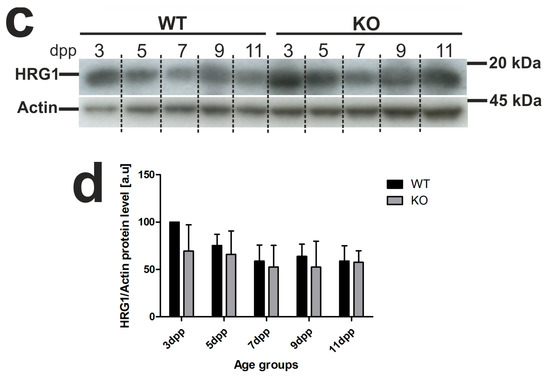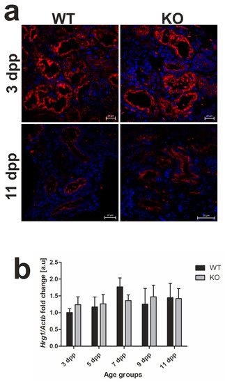 In our previous study [13], we localized the HRG1 protein in apical/subapical regions of epithelial cells of the renal cortex in WT neonates, which suggested its participation in the uptake of free heme from primary urine under conditions of neonatal hemolysis. Here, we confirmed this localization in the kidneys of both WT and Hmox1−/− mice (Figure 4a). Importantly, we show that, despite the enhanced hemolysis in Hmox1−/− neonates, expression of the Slc48a1 gene (encoding HRG1 protein) at both messenger RNA (mRNA; Figure 4b) and protein (Figure 4c,d) levels remains unaltered compared to WT mice throughout the entire experimental period.