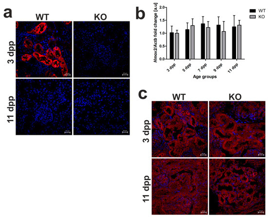 Heme oxygenase 1 (HO1) and heme oxygenase 2 (HO2) expression in the kidneys of wild-type and Hmox1-deficient neonatal mice. (a) Immunofluorescence (IF) staining of HO1 (red channel) in the kidneys of 3 and 11 day old wild-type (WT) and Hmox1 knockout (KO) neonatal mice, analyzed by confocal microscopy. Cell nuclei were counterstained with DAPI (blue). Scale bars correspond to 20 μm. (b) RT-qPCR analysis of HO2 mRNA levels in the kidneys of WT and KO mouse neonates ranging from 3–11 days old. The graph presents relative HO2 transcript levels in arbitrary units (means ± SD, n = 5 per group; Student t-test, NS). (c) IF staining of HO2 (red channel) in the kidneys of 3 and 11 day old WT and KO neonatal mice, analyzed by confocal microscopy. Cell nuclei were counterstained with DAPI (blue). Scale bars correspond to 20 μm. dpp—days postpartum, NS—not significant.