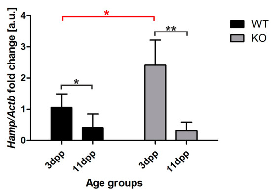 Hepcidin (Hamp) expression in the liver of wild-type (WT) and heme oxygenase 1 (HO1) knockout (KO) mice. RT-qPCR analysis of hepcidin mRNA levels in the livers of WT and KO 3 and 11 day old mouse neonates. The graph presents relative hepcidin transcript levels in arbitrary units (means ± SD, n = 5 per group). To compare differences, we used Student t-test; * p < 0.05, ** p < 0.01. dpp—days postpartum.