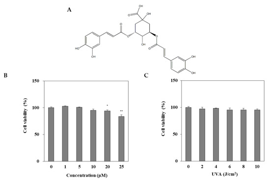 Figure 1. Chemical structure of 3,5-dicaffeoyl-epi-quinic acid (A) and its effect on viability (B) of human dermal fibroblasts (HDFs). HDFs were irradiated with UVA (0–10 J/cm2) and incubated for 24 h and the viability of the cells were measured by MTT assay (C). The data are presented as mean ± standard deviation of three experiments in each group. Statics represented mean ± SD of three independent experiments. * p < 0.05 and ** p < 0.01 vs. blank group.
