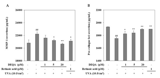 Figure 2. Effect of DEQA on the release of MMP-1 (A) and procollagen Iα1 (B) in UVA-irradiated HDFs. Cells were treated with given concentrations of DEQA, and then the cell-free supernatants were collected for ELISA assay. The data are presented as mean ± standard deviation of three experiments in each group. ## p < 0.01 vs. no UVA irradiation group, * p < 0.05 and ** p < 0.01 vs. only UVA irradiation group.