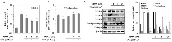 Figure 3. Effect of DEQA on expressions of MMPs and type I procollagen in UVA-irradiated HDFs. Cells were exposed to UVA at 10 J/cm2 and treated with given concentrations of DEQA for 24 h. The mRNA expression of MMP-1 (A) and type I procollagen (B) were analyzed by RT-qPCR. Protein levels of MMP-1, MMP-3, MMP-9, type I procollagen and collagen were determined by Western blotting (C). β-actin was used as an internal reference for RT-qPCR and Western blotting. The data are presented as mean ± standard deviation of three experiments in each group. ## p < 0.01 vs. no UVA irradiation group, * p < 0.05 and ** p < 0.01 vs. only UVA irradiation group.
