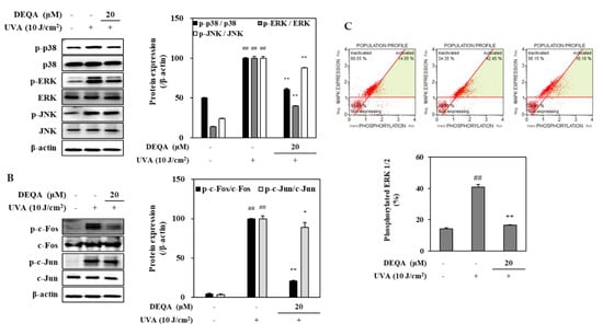 Figure 4. Effect of DEQA on MAPK/AP-1 signaling in UVA-irradiated HDFs. Cells were exposed to UVA at 10 J/cm2 and treated with 20 μM DEQA for 24 h. Phosphorylated MAPKs (p-p38, p-JNK and p-ERK) (A) and AP-1 activation (B) were detected by Western blotting. β-actin was used as an internal standard. DEQA-mediated activation of ERK1/2 in UVA-irradiated HDFs (C) was analyzed, using flow cytometry and MAPK activation dual detection kit. The data are presented as mean ± standard deviation of three experiments in each group. ## p < 0.01 vs. no UVA irradiation group, * p < 0.05 and ** p < 0.01 vs. only UVA irradiation group.
