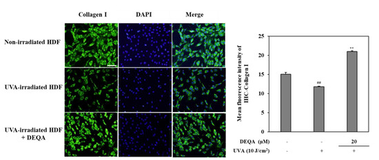Figure 5. Effect of DEQA on collagen levels in the UVA-irradiated HDFs. Cells were exposed to UVA at 10 J/cm2 and treated with 20 μM DEQA for 24 h. Images from immunofluorescence staining of collagen I (green). Nuclei were counterstained with DAPI to reveal cell density (blue). Cellular collagen was visualized by fluorescence microscopy. Semi-quantitative analysis of collagen I staining was performed, using imageJ-software, and values were normalized against DAPI staining. ## p < 0.01 vs. no UVA irradiation group and ** p < 0.01 vs. only UVA irradiation group. Scale bar: 100 μm.