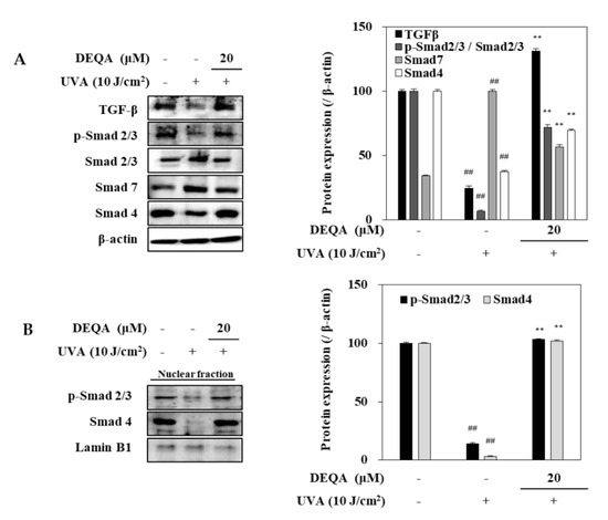 Figure 6. Effect of DEQA on activation of TGF-β/Smad signaling in UVA-irradiated HDFs. Cells were exposed to UVA at 10 J/cm2 and treated with 20 μM DEQA for 24 h. Protein expression levels of TGF-β, phosphorylated (p-) and inactive Smad 2/3, Smad 7 and Smad 4 in whole cell lysates (A) and phosphorylated Smad 2/3, and Smad 4 expression levels in nuclear fraction (B) were detected by Western blotting. β-actin was used as an internal standard in the whole lysates and Lamin B1 in the nuclear fraction. The data are presented as mean ± standard deviation of three experiments in each group. ## p < 0.01 vs. no UVA irradiation group, and ** p < 0.01 vs. only UVA irradiation group.