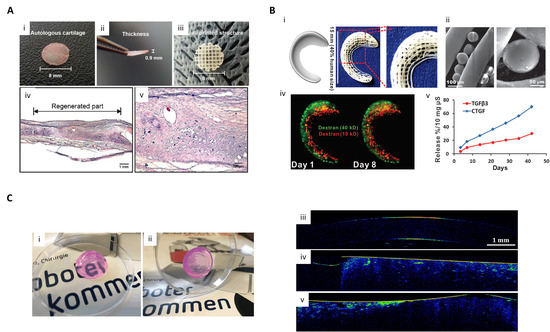 Therapeutic applications of 3D printing for cartilage and cornea regeneration. (A) 3D cell printed structure for cartilage defect treatment. (i,ii) Autologous cartilage; (iii) Cell-printed structure; (iv,v) HE staining result of in vivo cell-printed structure implantation (reproduced with permission from ref [144]; copyright 2017 Wiley-VCH). (B) Scaffold spatiotemporally releasing growth factor for meniscus defect treatment. (i) Anatomic reconstruction of a human meniscus and 3D-printed meniscus scaffold; (ii) PLGA microspheres encapsulating growth factors with PCL microfibers; (iii) Maintenance of fluorescent dextrans in meniscus scaffold from Day 1 to Day 8; (iv) growth factor release profile from the scaffold over time (reproduced with permission from ref [147]; copyright 2014 American Association for the Advancement Science). (C) 3D structure of bioprinted models with human corneal stromal keratocytes and their optical properties. (i,ii) Transparent bioprinted dome-shaped artificial corneas consisting of 0.5% agarose and 0.2% collagen Type I. (iii—v) Optical coherence tomography images of native rabbit corneas; (iii) Cell-free blend of 0.5% agarose with 0.2% collagen Type I; (iv) Corneal stromal keratocyte-loaded hydrogel blend; (v) corneal stromal keratocyte-loaded hydrogel blend (reproduced with permission from ref [148]; copyright 2019 Wiley-VCH).